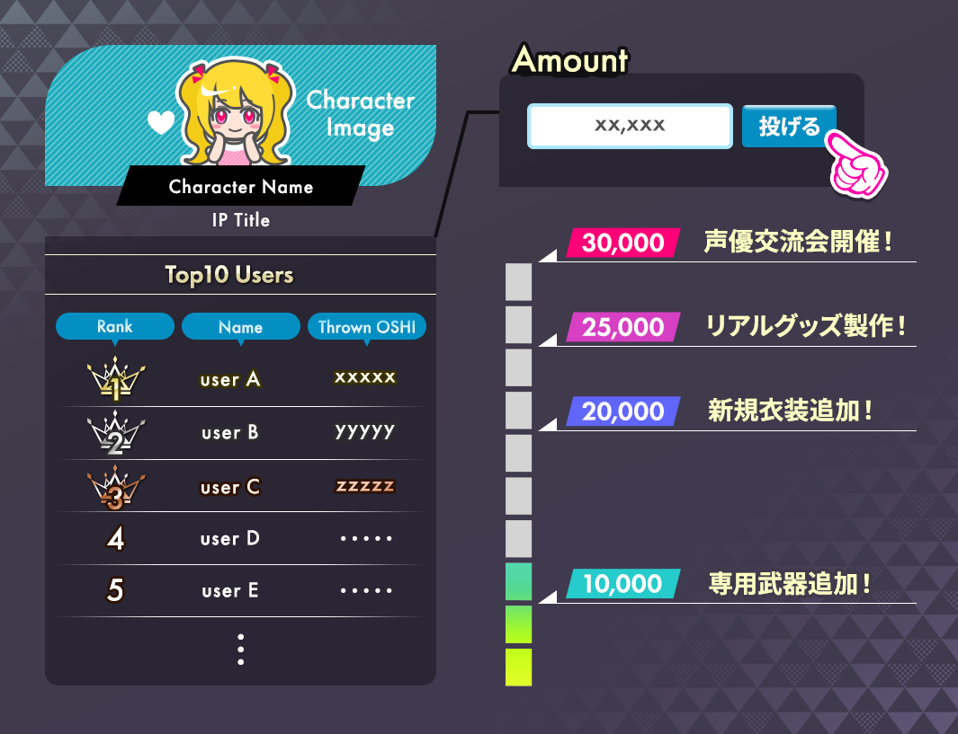 送信されたOSHIの枚数に応じて、例えば送信枚数が一定基準を超えたキャラクターは実際に連携ゲームに実装されたり、リアルグッズの製作が決定されるなど予定しています。参加者はOSHIを送信した枚数によってランキング付けされ、上位一定数は常に表示され、自身の推しへの愛は全世界に発信されます。