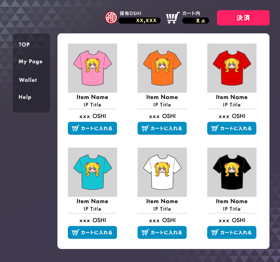 関連コンテンツやコラボしたIP作品の限定アートや、ゲームほか各コンテンツ内で使用可能なアイテムをOSHIで購入することができるwebショップを用意します。