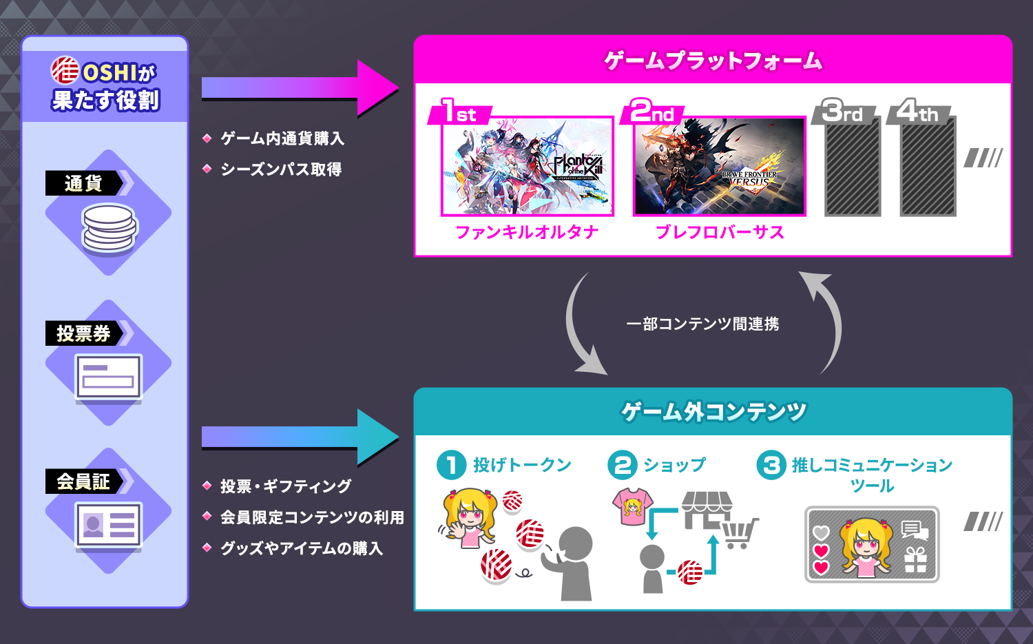 OSHIを基軸としたトークン経済圏の実現として、ユーザー（ファン）が長期的にゲームを楽しみながら、安心して推し活（トークンの利用）ができる場を構築します。