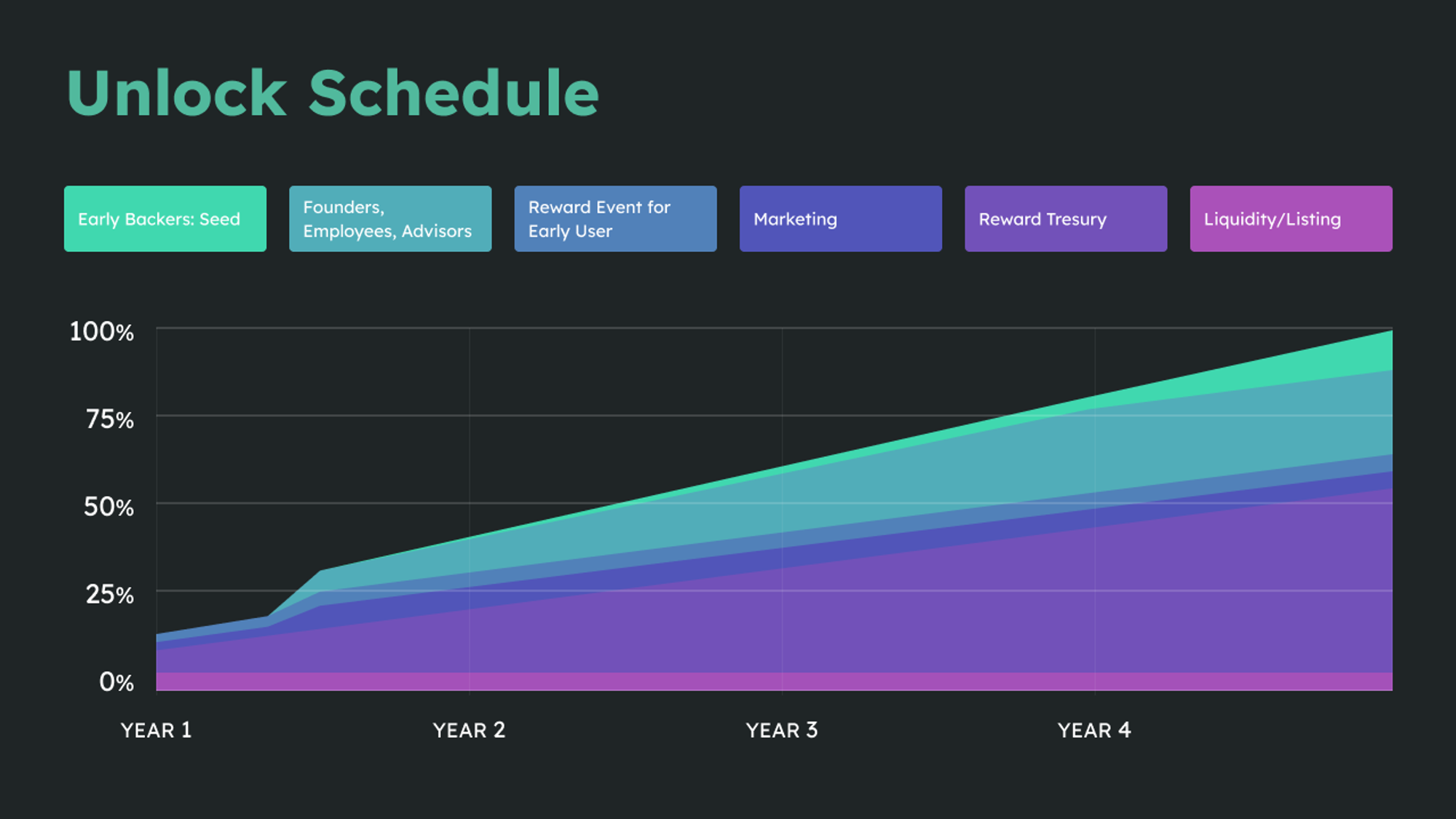 ※ 上記グラフにおいて、TGEはYear1の左端にあたります。 なお、上記グラフはロックアップ解除スケジュールを視覚化したものです。詳細は上記の説明をご参照ください。